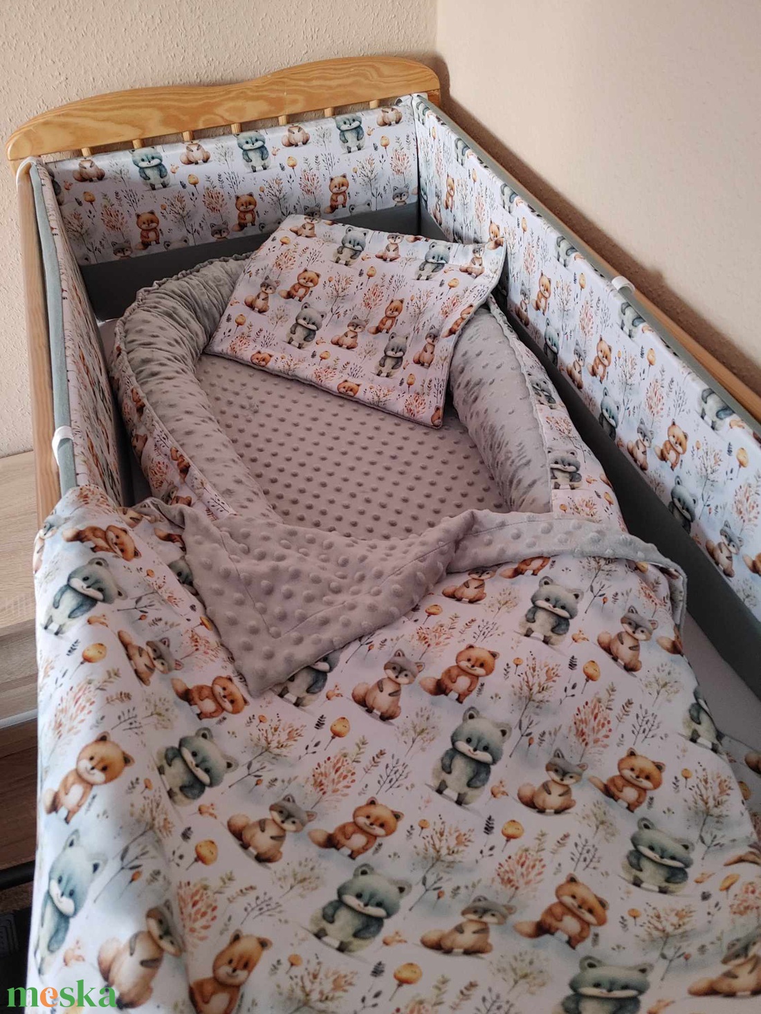 Gyönyörű élénk színek jellemzik, ezért már szemmel is jól látható a különlegessége, és szépsége. A babaágynemű szett tartalma: - babatakaró, melynek egyik oldala a mintás pamutszatén, másik oldala zsálya színű minky - babapárna, mely szintén a pamutszatén és minky anyagból készült - rácsvédő, melynek egyik oldala pamutszatén és zsálya színű pamutvászon kombinációja, másik oldala zsálya pamutvászon. A rácsvédő 2 cm vastag szivacsbetéttel van ellátva, mely az alján lévő cipzáras megoldásnak köszönhetően könnyedén kivehető és visszahelyezhető. A szivacsbetétnek köszönhetően gyönyörű a tartása, és biztosan megvédi kisbabádat, nem rogyik meg, és nem vékonyodik el használat során. Több ponton is elláttam rögzítőszalaggal. (60*120 cm-es babaágyba való, melyben teljesen körbeér) - babafészek: mi az aljába 2 cm vastag kivehető szivacsot teszünk, amely nem csak stabil, biztonságos, kényelmes fekvőfelületet biztosít, de a légzésfigyelő is bele helyezhető. Így bárhol nyugodt lehetsz, kisbabád biztonságban van. Nem gyűrődik még a mozgékony babák alatt sem, így mindig megfelelő kényelmet nyújt. A szivacsbetét egy mozdulattal kivehető, és visszahelyezhető, így mosása is egyszerű, és kétoldalasan használható. 30 fokon mosható. Ebből a pamutszaténból korlátozott mennyiséggel rendelkezem, így ha valamilyen más terméket, vagy más méretekre lenne szükséged, kérlek vedd fel velem a kapcsolatot, hogy egyeztetni tudjunk. Takaró mérete 80*100 cm Párna mérete 30*40 cm Rácsvédő magassága 25 cm Rácsvédő hossza 360 cm (60*120 cm-es babaágyba teljesen körbeér) Babafészek belső, fekvőfelület mérete 35*70 cm ( L- es ) Anyaga Prémium pamutszatén, pamutvászon, minky Színe mintás, zsálya